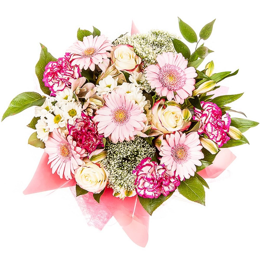 | Cтандартний | 3 троянда, 3 гербера міні, 2 сантіні (хризантема), гіпсофіла, 2 альстромерія, 3 гвоздика, зелені наповнювачі |