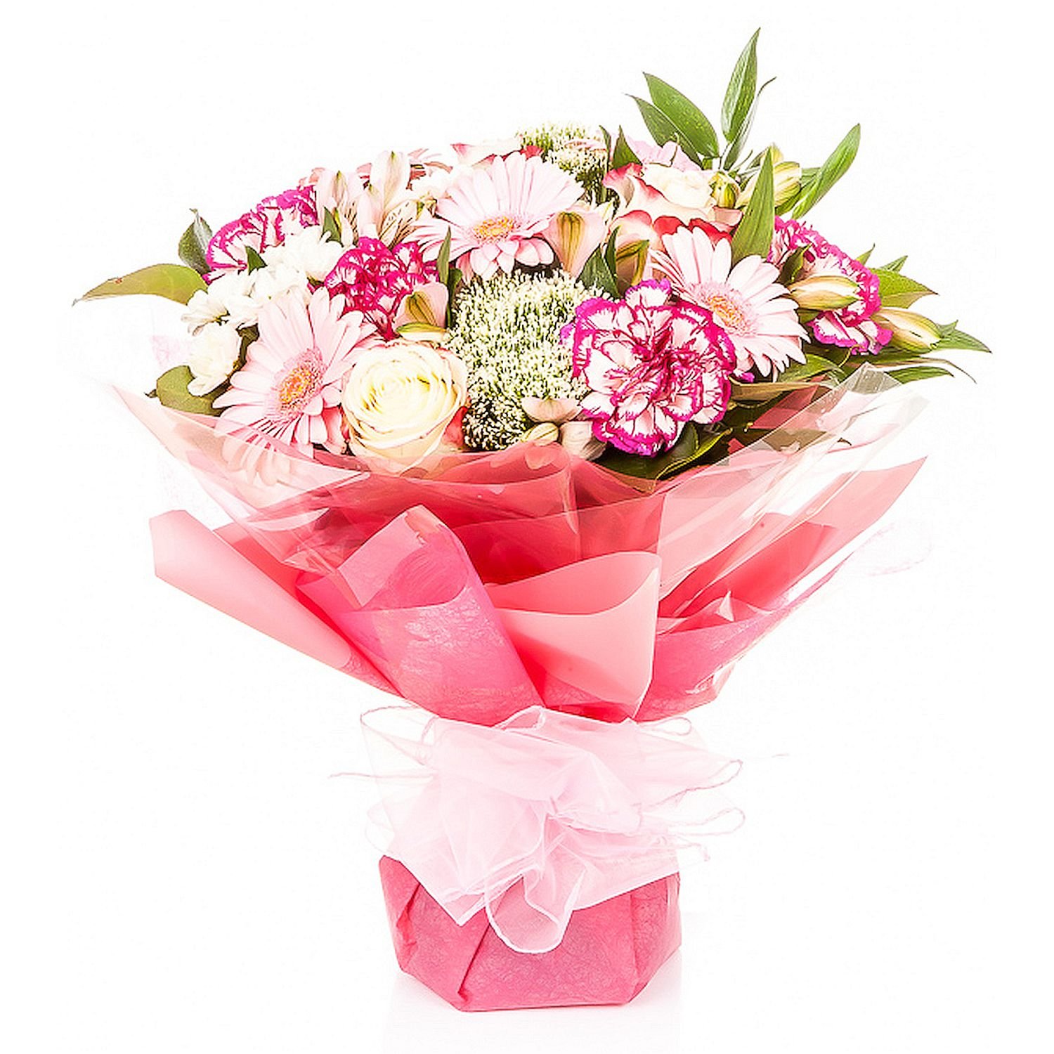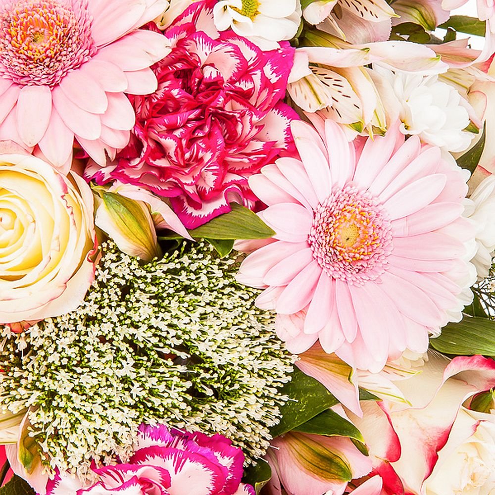 | Великий | 5 троянда, 5 гербера міні, 3 сантіні (хризантема), 2 гіпсофіла, 3 альстромерія, 5 гвоздика, зелені наповнювачі |